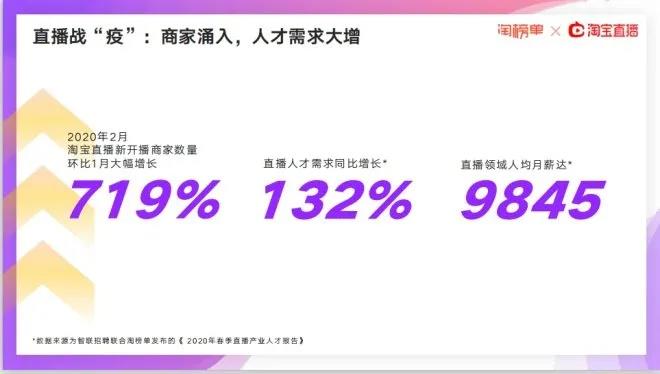 智聯(lián)招聘聯(lián)合淘榜單發(fā)布的《2020年春季直播產(chǎn)業(yè)人才報告》顯示,2020年2月淘寶直播新開播商家數(shù)量環(huán)比1月大幅增長,達到719%;直播人才需求同比增長132%,直播領域人均月薪達9845元。