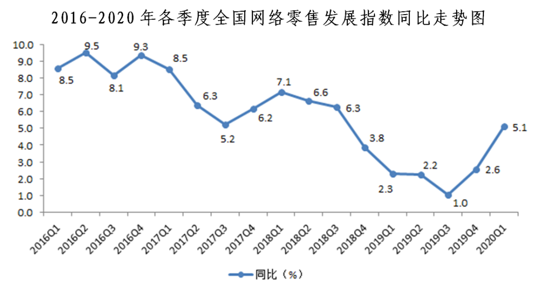 近日,中國(guó)國(guó)際電子商務(wù)中心與易觀聯(lián)合發(fā)布了2020年一季度“全國(guó)網(wǎng)絡(luò)零售發(fā)展指數(shù)”及其分指數(shù)。2020年一季度,全國(guó)網(wǎng)絡(luò)零售發(fā)展指數(shù)受疫情影響,環(huán)比下降2.7%,增速較上季度下降6.1個(gè)百分點(diǎn);但同比仍增長(zhǎng)5.1%,增速較上季度提升2.5個(gè)百分點(diǎn)。