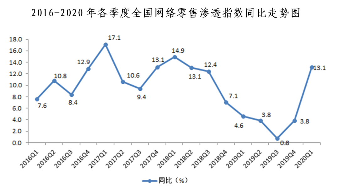 二、網(wǎng)絡(luò)零售滲透指數(shù)同比增長(zhǎng)13.1%,環(huán)比下降3.3%。