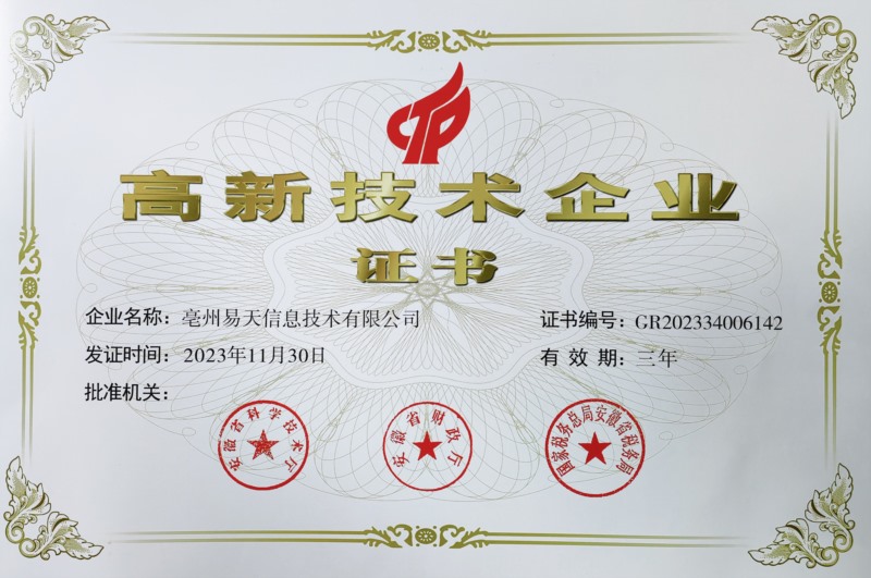 高新技術(shù)企業(yè)證書是對企業(yè)在技術(shù)研發(fā)、產(chǎn)品創(chuàng)新、市場競爭力等方面綜合實力的權(quán)威評價。獲得這一證書,不僅意味著亳州易天科技在技術(shù)研發(fā)和創(chuàng)新方面取得了顯著成就,還代表著公司在推動行業(yè)技術(shù)進(jìn)步、促進(jìn)地方經(jīng)濟(jì)發(fā)展等方面做出了積極貢獻(xiàn)。
